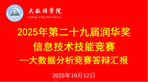 【大数据学院讯】2025年10月12日,由江西服装学院大数据学院主办的第二十九届“润华奖”信息技术技能竞赛大数据分析竞赛答辩汇报在线上成功举行。本届赛事吸引了广大学生积极参与,通过筛选,共计十三个小组参赛获得最终答辩资格,答辩评委由学院副院长赵德福及教师组成,会议由数据科学教研室主任吴琴琴主持,本次答辩聚焦大数据分析领域,为学院学子提供了展示专业素养与创新能力的舞台。