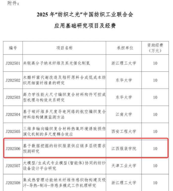 【大数据学院讯】近日,2025年“纺织之光”中国纺织工业联合会应用基础研究项目立项结果正式公示。我院王军博士申报的课题《基于数据挖掘的纺织服装供应链多层级需求预测研究》成功获批立项,并获10万元专项资助。