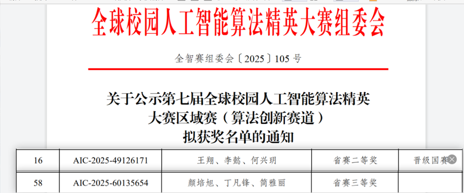 作为首次参赛的队伍,我院学子凭借扎实的专业积累从容应战。其中,我院王翔、李懿、何兴玥团队凭借对算法问题的深入剖析与创新性解决思路,荣获省赛二等奖并成功晋级国赛,体现了我院学子在人工智能算法领域的钻研深度与实践活力;颜培旭、丁凡锋、简雅丽团队以严谨的算法逻辑与有效的应用方案斩获省赛三等奖,展现了多元发展的专业潜力与扎实的技术应用功底。