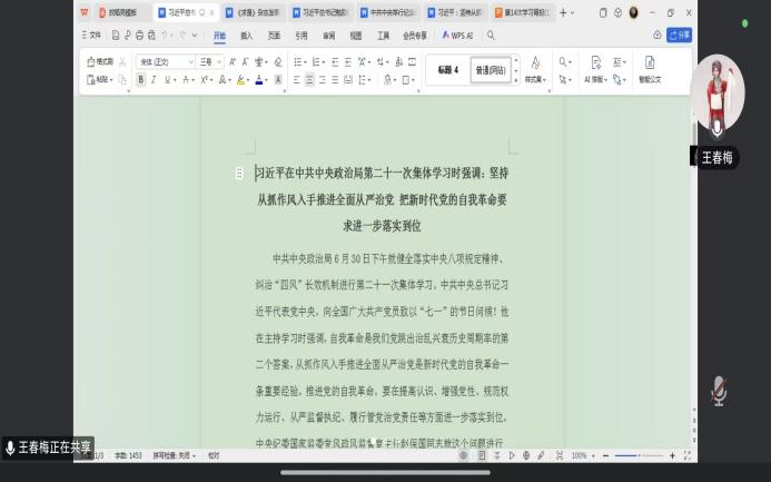 会议第一阶段,王春梅书记传达学习《习近平在中共中央政治局第二十一次集体学习时强调 坚持从抓作风入手推进全面从严治党 把新时代党的自我革命要求进一步落实到位》。重点解读了“自我革命是我们党跳出治乱兴衰历史周期率的第二个答案”的深刻内涵,以及从抓作风入手推进全面从严治党的实践要求;随后,她领学《中共中央举行纪念陈云同志诞辰120周年座谈会 习近平发表重要讲话》与《习近平回信勉励西藏林芝市巴宜区林芝镇嘎拉村全体村民 切实维护好民族团结 创造更加幸福美好的生活》,带领大家重温陈云同志的崇高革命风范,深入领会习近平总书记关于切实维护民族团结、创造幸福美好生活的殷切嘱托,引导全体参会人员强化责任担当、筑牢思想根基。