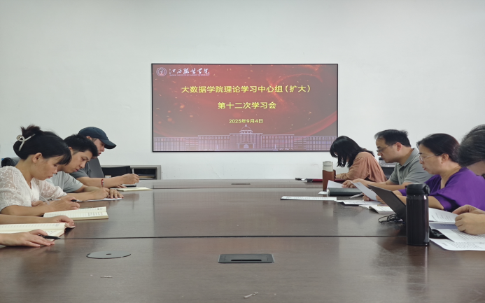 【大数据学院讯】为深入学习贯彻习近平总书记最新重要讲话精神,加强学院党的建设和作风建设。2025年9月4日,江西服装学院大数据学院在主教楼246室召开理论学习中心组(扩大)第十二次学习会议。学院党总支书记王春梅主持会议并作重要讲话,学院党总支全体委员、教师党支部全体委员、学生党支部全体委员及科级以上干部参加了本次会议。