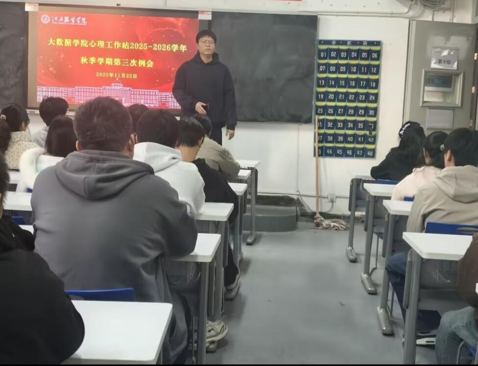 【大数据学院讯】为积极响应学校关于加强校园心理健康文化建设、提升朋辈心理互助效能的号召,2025年11月25日周二下午16:50,大数据学院心理工作站在主教学楼452教室举办本学期第三次心理委员能力提升培训会。本次会议由心理工作站站长陈志聪老师主持,全体心理委员参加。