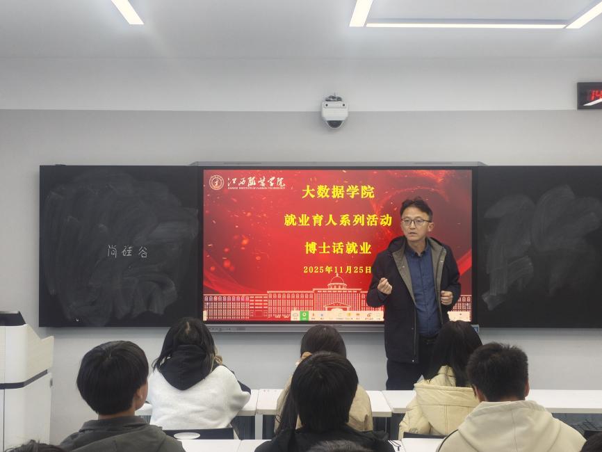 【大数据学院讯】2025年11月25日下午15:00,江西服装学院大数据学院在主教楼316教室开展以“博士话就业”为主题的就业指导讲座,旨在让学生明晰AI时代下就业市场的趋势,更好选择自身职业路径、适应市场变化。学院王继环、张川两位博士分别为同学们带来行业干货,在现场以数据、案例与实操方案构建起就业指引体系。