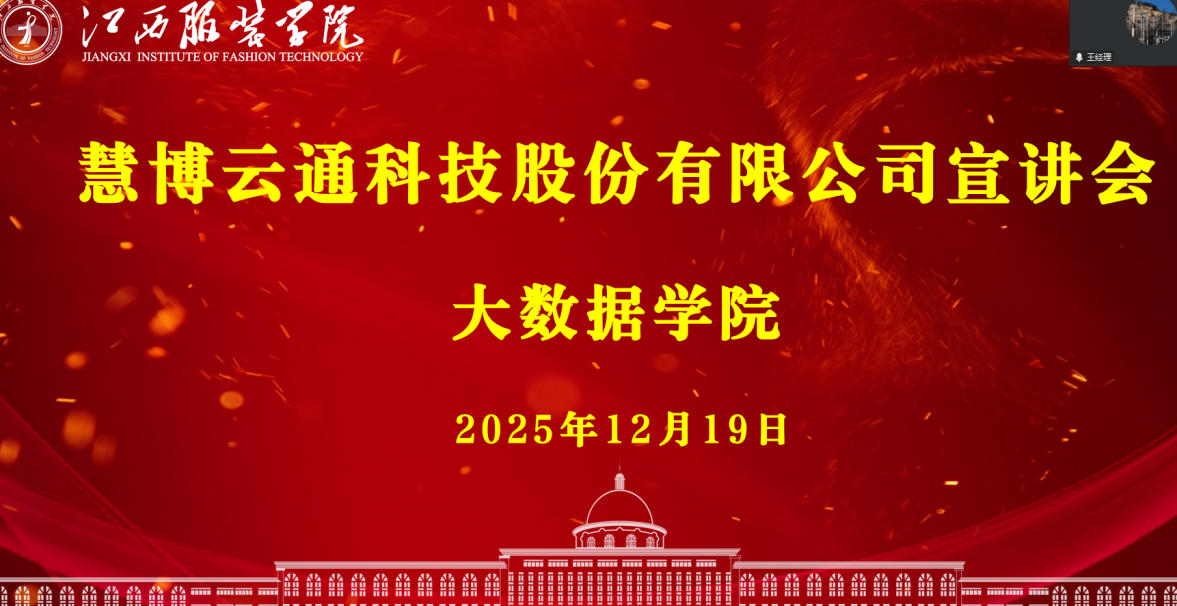 【大数据学院讯】2025年12月19日上午10:30,江西服装学院大数据学院通过线上平台举办慧博云通科技股份有限公司专场宣讲会,为2026届毕业生拓宽求职渠道,提供多元化的就业选择。会议由就业联络员陈志聪老师主持。