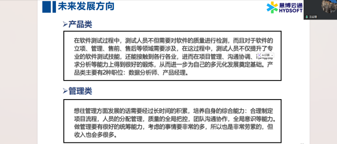 宣讲会上,慧博云通杭州路福人事王经理以企业发展历程为切入点,系统介绍了慧博云通的发展概况与核心业务。作为国家高新技术企业,慧博云通于2009年成立,2022年成功登陆创业板IPO上市,作为行业内的优质企业,其业务涵盖软件开发与测试、BPO等多个领域,服务网络辐射全球多地,合作客户包含众多知名企业,凭借专业的技术与服务形成了核心竞争力,让同学们对企业综合实力与发展前景有了全面认知。