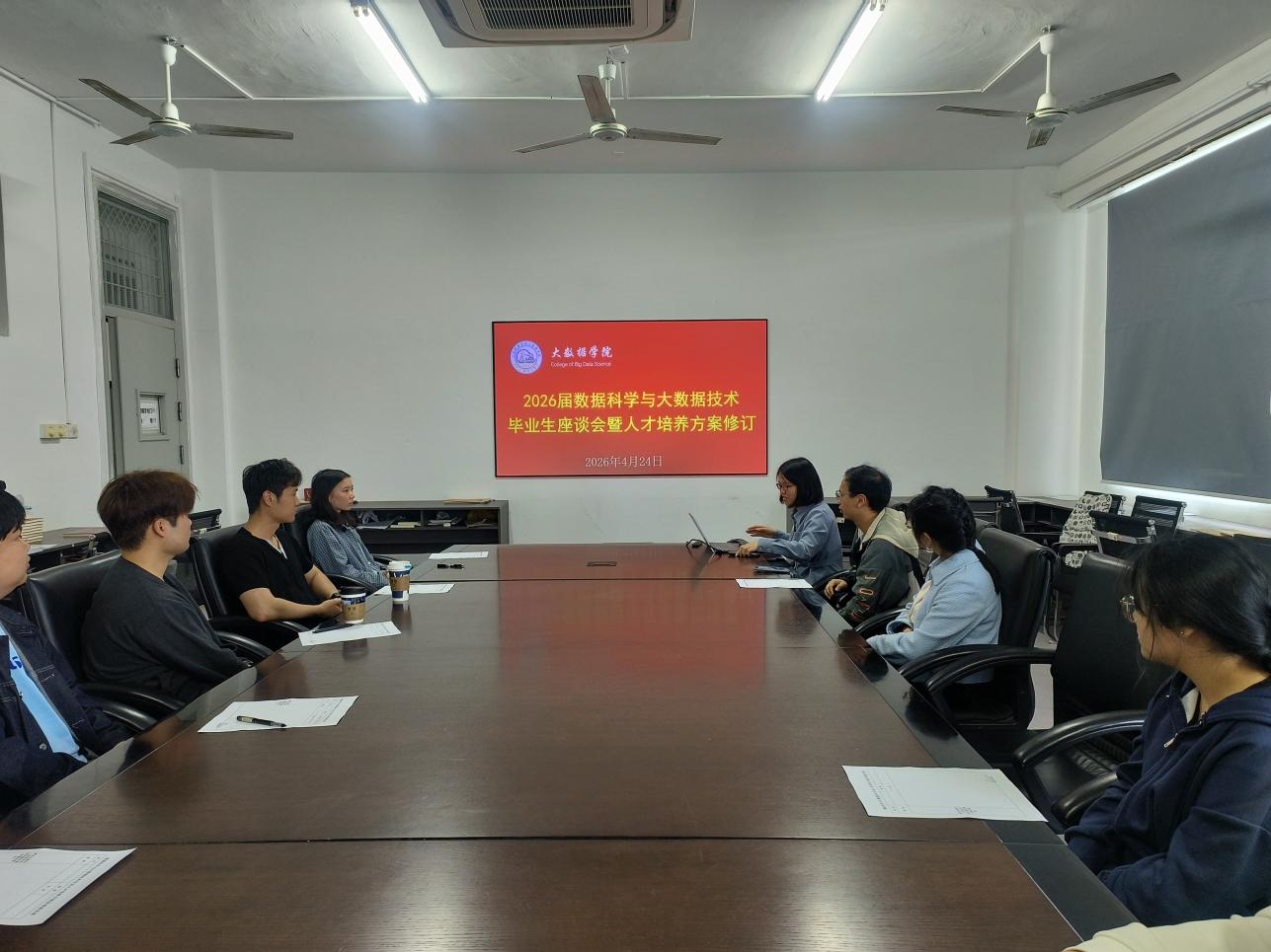 【大数据学院讯】为进一步提升人才培养质量,精准对接行业需求与学生发展诉求,扎实推进数据科学与大数据技术专业本科人才培养方案修订工作,2026年4月24日,大数据学院数据科学与大数据技术专业召开本科毕业生座谈会暨本科人才培养方案修订座谈会。本次座谈会由院长助理、数据科学与大数据技术专业负责人吴琴琴主持,数据科学教研室副主任桂林、骨干教师罗菊香及本专业本科毕业生代表参会,师生围绕课程设置、实践教学、就业能力提升、人才培养方案优化等议题深入交流、共商发展。