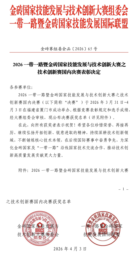 【大数据学院讯】2026年4月3日,2026年一带一路暨金砖国家技能发展与技术创新大赛之技术创新赛国内决赛在福建省厦门市圆满落幕,获奖名单正式公布。经过激烈角逐,我院参赛团队在人工智能融合应用赛道和数字健康与医疗赛道中表现亮眼,凭借扎实的专业基础、突出的创新能力和良好的团队协作精神,斩获多项荣誉,充分展现了大数据学院学子昂扬向上的精神风貌和学院人才培养的扎实成效。