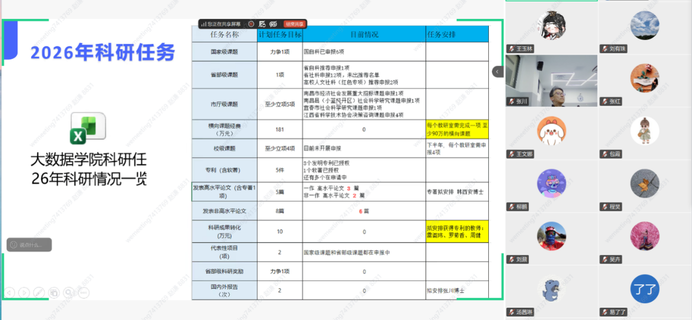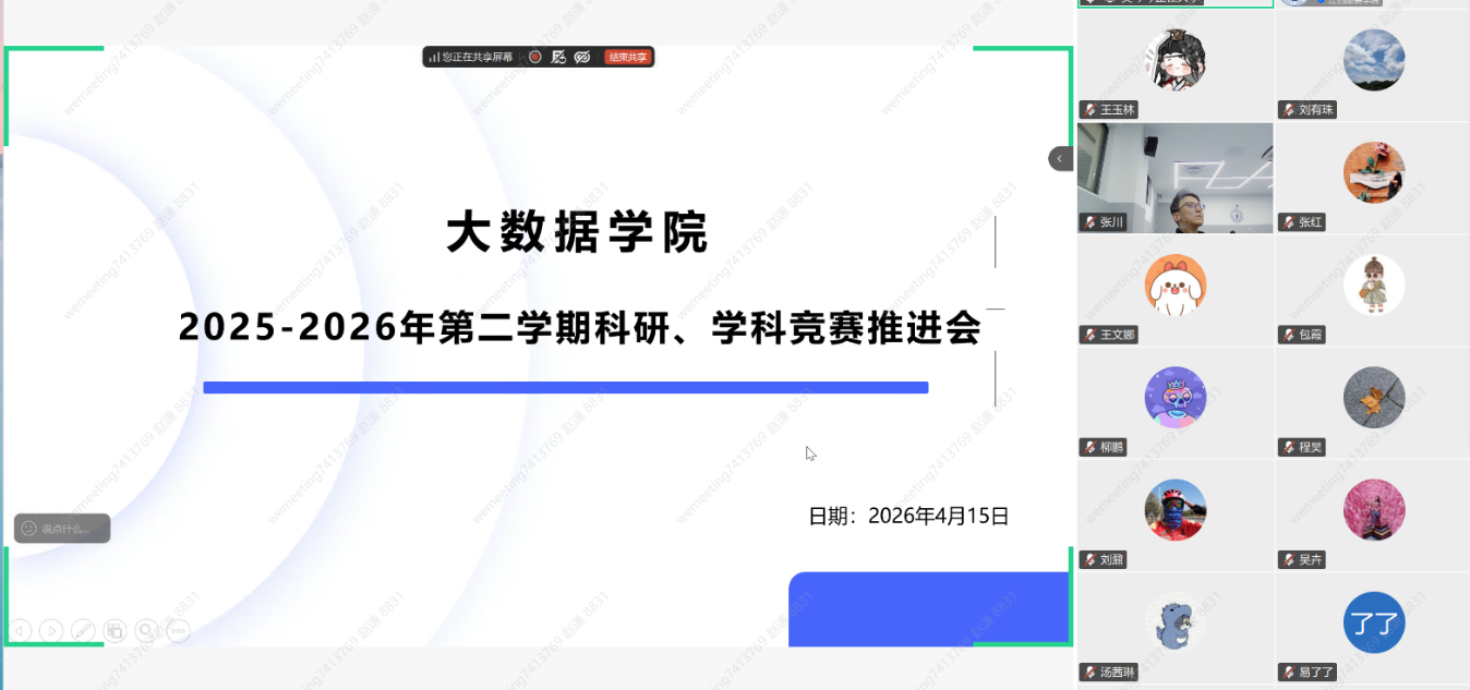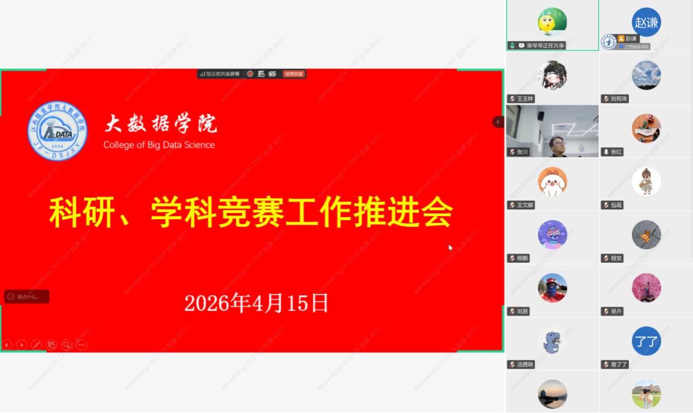 【大数据学院讯】2026年4月15日晚19:00,大数据学院在线召开2026年科研与学科竞赛工作推进会,总结2026年第一季度科研及学科竞赛的总体情况并针对第二季度的科研及学科竞赛工作进行部署。学院院长徐照兴、副院长赵德福、院长助理吴琴琴等出席会议并作重要讲话。全体教职工齐聚线上会议,共谋学院科研与竞赛工作高质量发展新篇章。