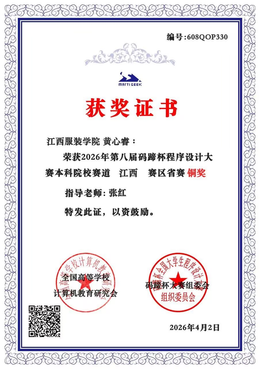 【大数据学院讯】2026年4月2日,2026年码蹄杯程序设计大赛省赛第一场获奖名单正式揭晓,我院大一学子黄心睿凭借扎实的编程基础、清晰的解题思路和出色的临场发挥,在众多参赛选手中脱颖而出,荣获江西赛区省赛铜奖铜奖,为学院再添荣誉。